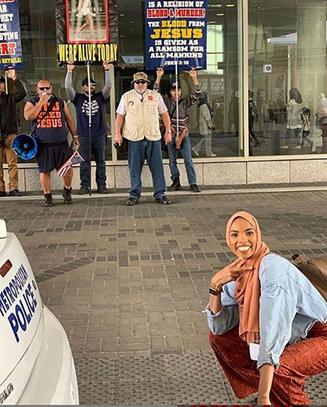 En bas à droite en premier plan, contrastant avec les manifestants américains, apparait Shaymaa Ismaa’eel parée de son hijab corail, radieuse, souriante, décontractée, fière et sûre d’elle face à des militants ne respectant pas sa religion et dans la réalisation de son acte courageux. La blogueuse fait le « V » de la victoire avec sa main droite.
